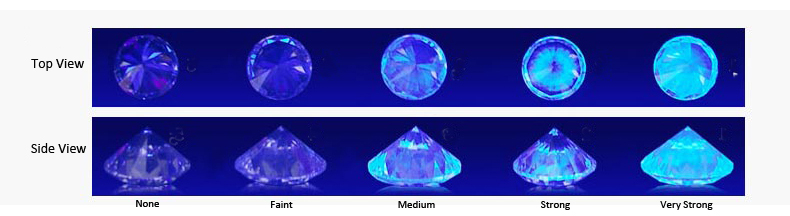 -       Ở trên các giấy chứng nhận chất lượng Kim Cương uy tín trên thế giới như GIA , HRD đều có ghi về Fluorescence. Nó được viết dưới lời chú giải màu sắc. Và chứng 5 nhận cấp độ Fluorescence như :